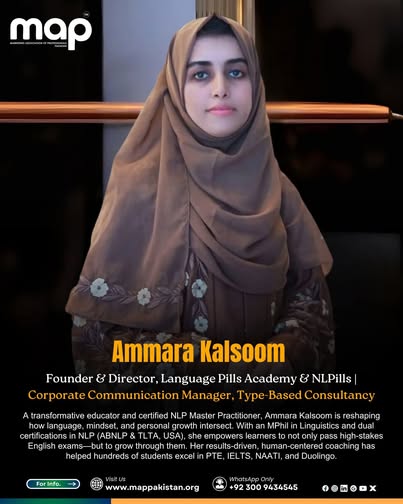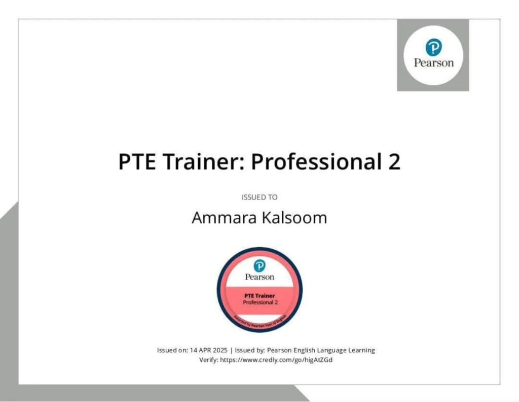 Ammara Kalsoom is a linguist, educator, and NLP Master Practitioner specializing in high-stakes English proficiency preparation, including PTE, IELTS, NAATI, and LanguageCert. With an academic foundation in linguistics and advanced NLP certifications from the United States, she integrates language science with mindset training to deliver structured, results-driven learning.